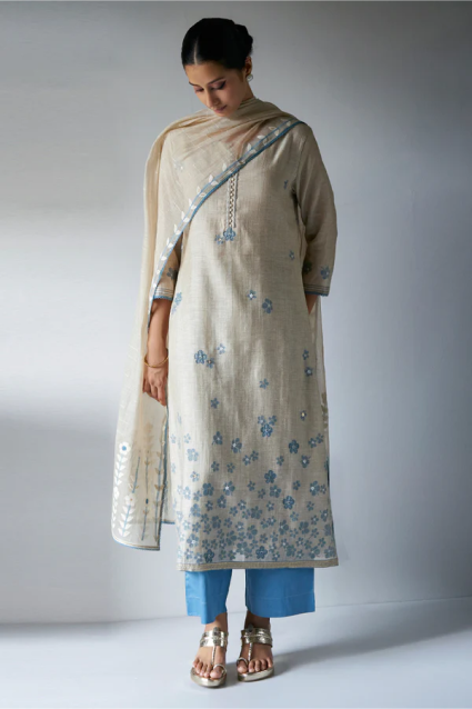 Fog Beige Woven Saree With Embroidery and Hand Work Detailing